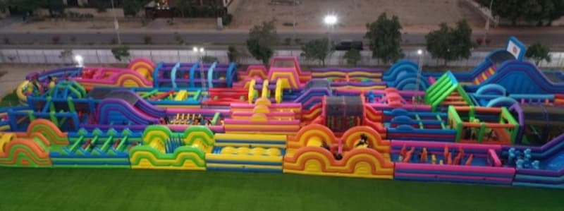 According to the Guinness World Records the largest Bouncing Castle is 1,421 m² (15,295.51 ft²) and was achieved by JUMBO JUMP (Pakistan), in Karachi, Pakistan on 20 November 2023 with a capacity of 200 people.